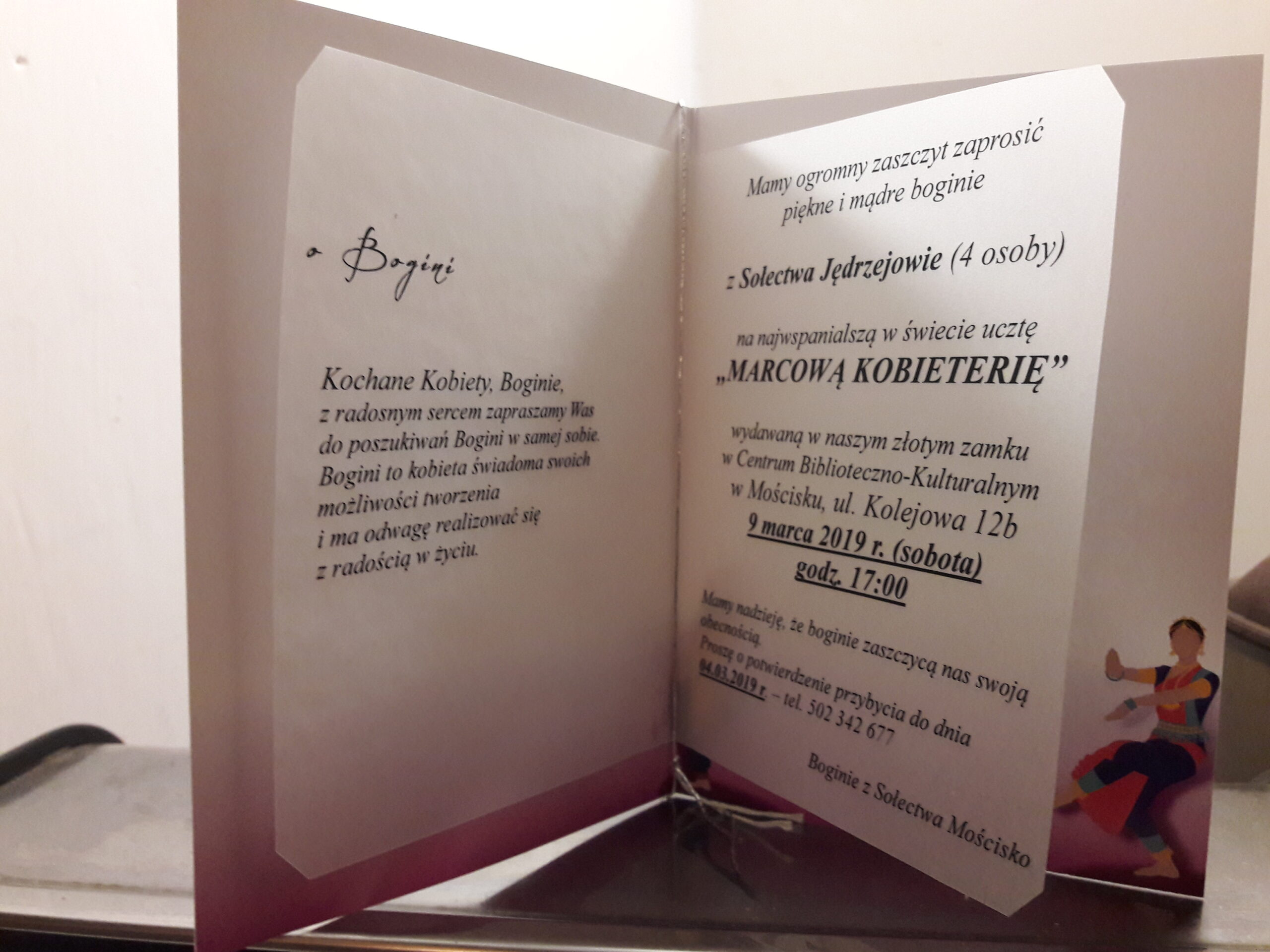 Sołtys Czesława Gorgol, w imieniu Sołectwa Mościsko, zaprasza mieszkanki Jędrzejowic do wzięcia udziału w Marcowej Kobieterii – gminnej imprezie z okazji Dnia Kobiet. Spotkanie bogiń w stylu Bollywood odbędzie się w tym roku w Mościskim Centrum Biblioteczno-Kulturalnym w sobotę, 9 marca 2019 r. o godzinie 17:00.