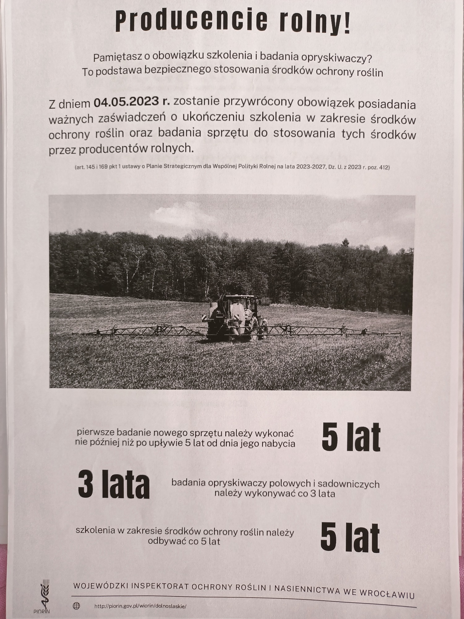 W związku z powyższym w myśl art. 169 pkt 1 ustawy z dnia 8 lutego 2023 r. o Planie Strategicznym dla Wspólnej Polityki Rolnej na lata 2023-2027 z dniem 4 maja 2023 r. zostanie przywrócony obowiązek posiadania ważnych zaświadczeń o ukończeniu szkolenia w zakresie środków ochrony roślin oraz obowiązek badania sprzętu do stosowania środków ochrony roślin przez producentów rolnych.