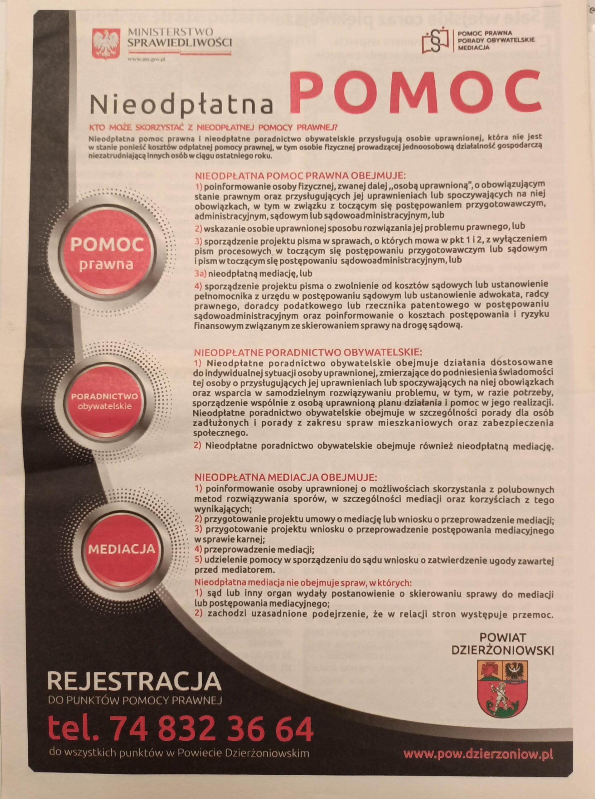 NIEODPŁATNA POMOC PRAWNA Napisano 2022-01-30 Oraz inne ciekawostki z biuletynu Urzędu Gminy Dzierżoniów Adwokat nie jest od tego, żeby klienta osądzać. Naszym zadaniem jest mu pomagać John Grisham Podobne wpisy Wesołych Świąt! Uroczysta narada sołtysów Pieniądze jednak to nie wszystko! O Autorze adminjedrzejowice