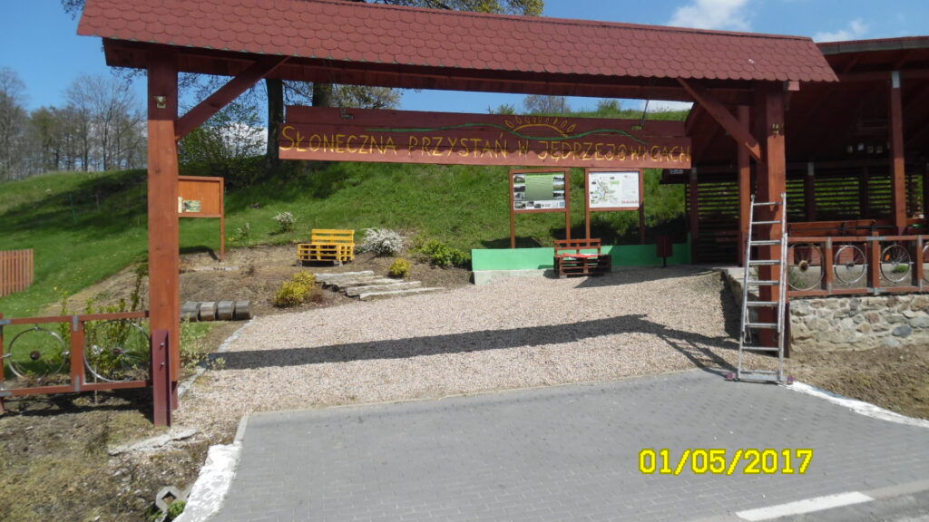 Koncepcja „Słonecznej przystani” została oparta o założenie stworzenia miejsca, które wypromowało by wieś a jednocześnie stanowiła miejsce spotkań dla mieszkańców. Wykorzystaliśmy fakt, że Jędrzejowice znajdują się na międzynarodowej trasie Eurovelo 9 (łączącej Bałtyk z Adriatykiem) i wokół tego tematu stworzyliśmy miejsce odpoczynku dla rowerzystów, którzy bardzo często tamtędy przejeżdżają. Dodatkowo zaprojektowaliśmy przestrzeń w postaci zadaszonej wiaty, gdzie mieszkańcy wsi będą mogli sprzedawać swoje produkty lokalne. Jest to pilotażowy projekt stworzenia logistycznych punktów odbioru produktów lokalnych dla małych wsi dla restauratorów czy większych odbiorców z pobliskich miast. Dziękujemy za okazane zaufanie i pomoc Panu Wójtowi Markowi Chmielewskiemu, jego zastępcy Pani Jolancie Zarzece, Pani Sołtys Czesławie Gorgol, Panu Krzysztofowi Hoholowi oraz mieszkańcom wsi Jędrzejowice a także osadzonym z zakładu penitancjarnego w Strzegomiu.