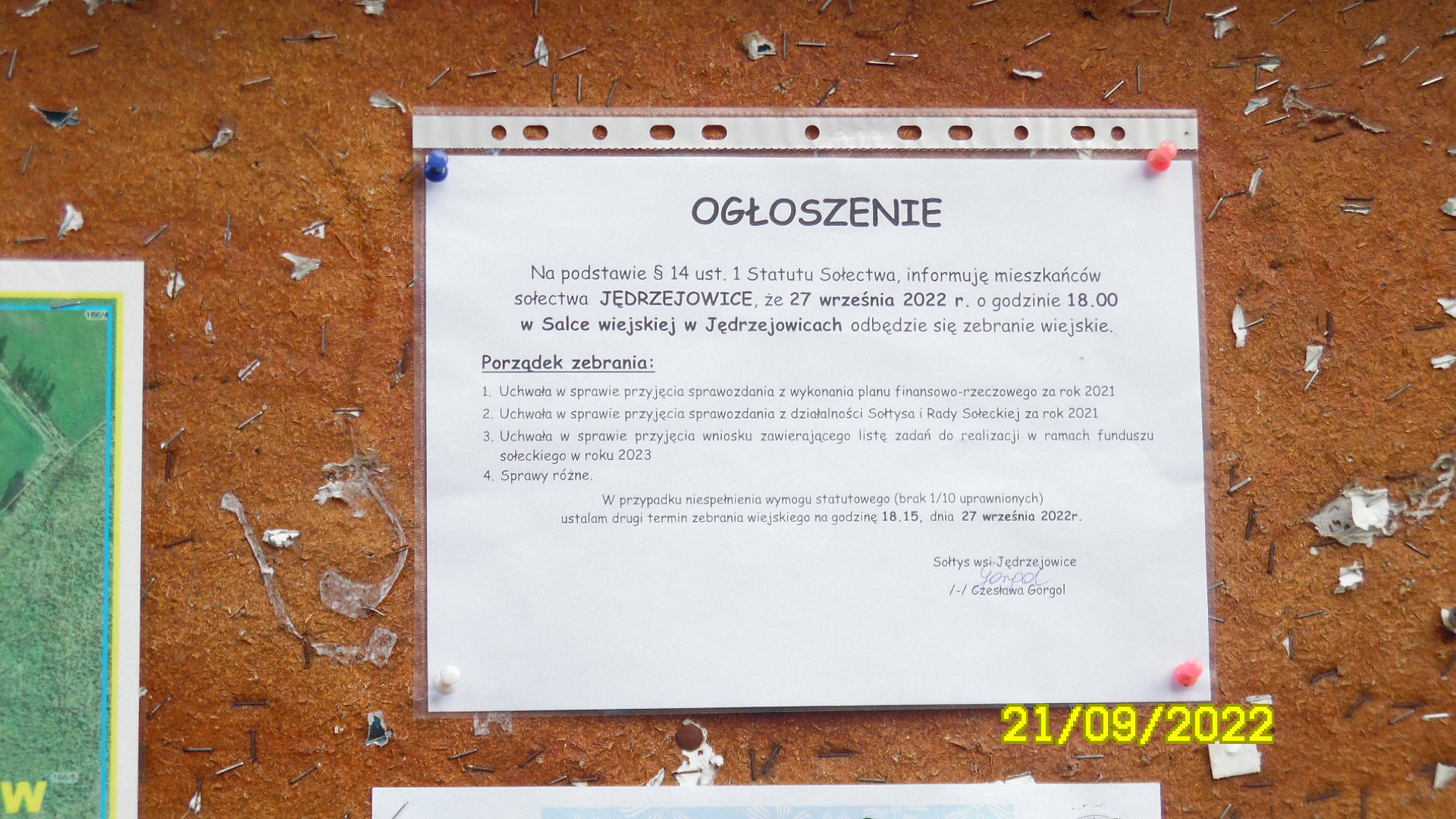 W dniu 27.09.2022 r. w Jędrzejowickiej świetlicy na boisku gminnym odbyło się zebranie wiejskie, w którym udział wzięła jedna piąta mieszkańców.