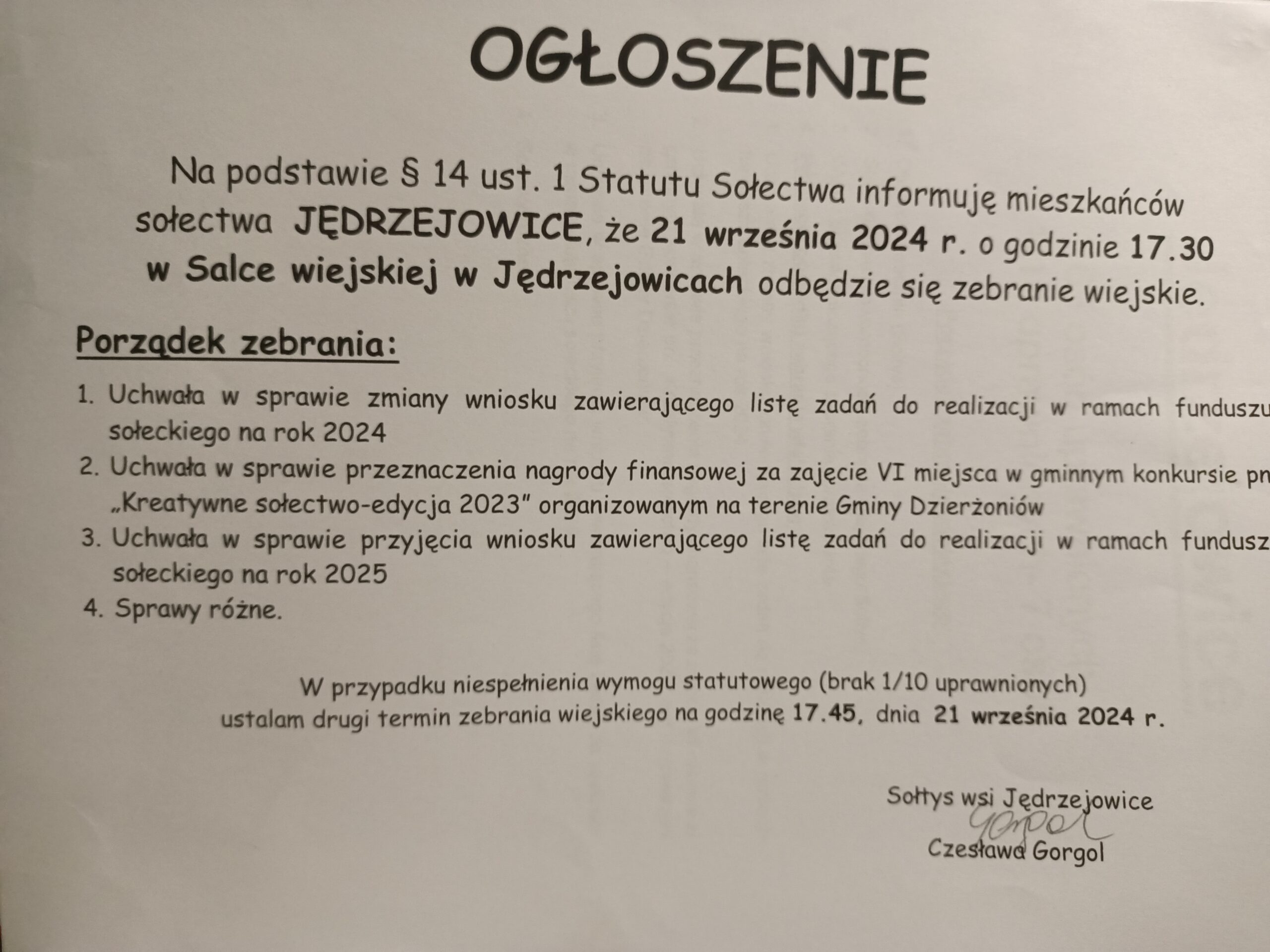 21 września podczas zebrania wiejskiego mieszkańcy podjęli uchwały ws.: