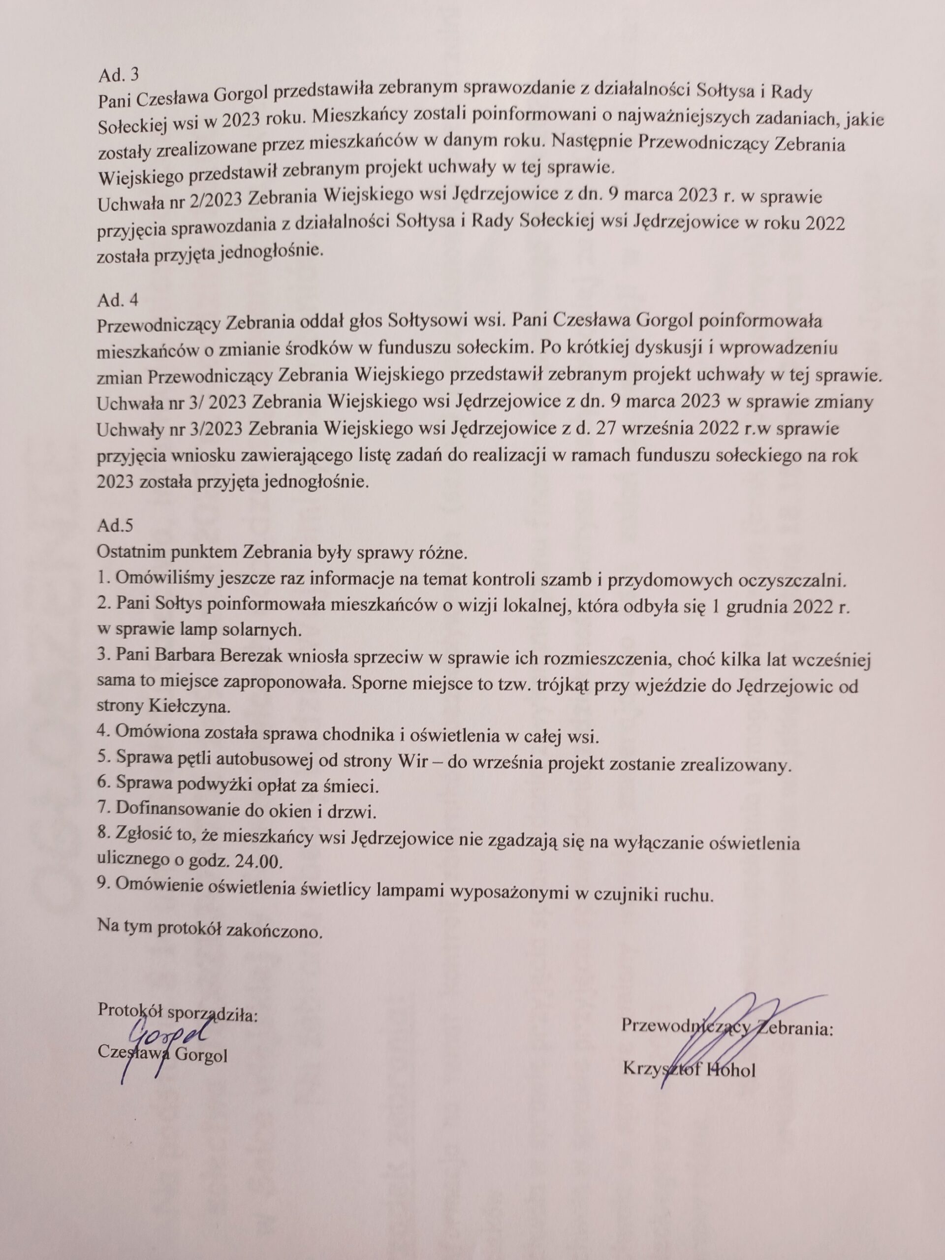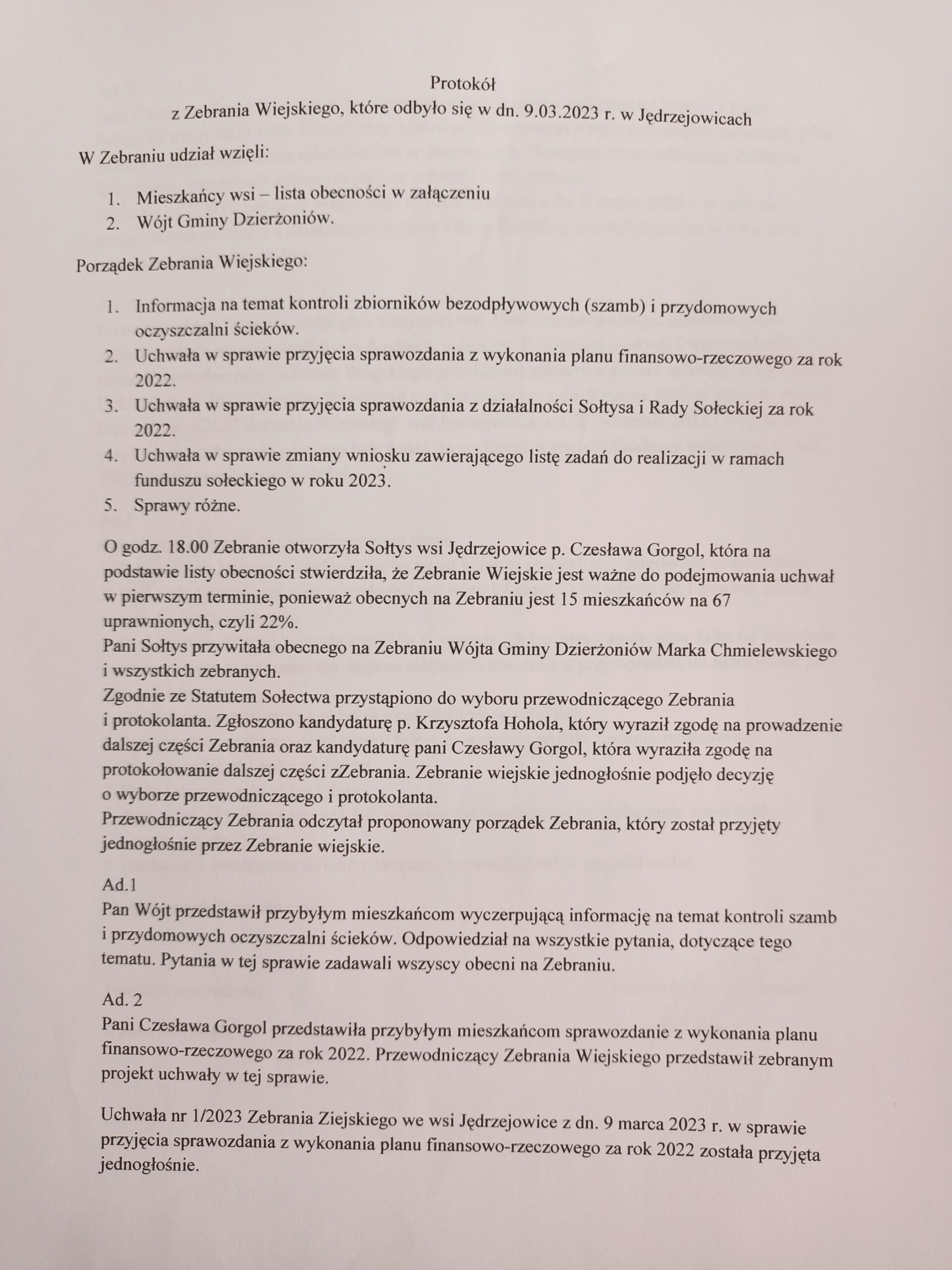 Na zebranie przybyła jedna czwarta uprawnionych mieszkańców wsi. Podczas zebrania dyskutowano na istotne dla Jędrzejowic tematy związane z gospodarką ściekami, oświetleniem we wsi oraz podjęto uchwały ws. finansów i sprawozdanie z działalności sołtysa i rady sołeckiej za rok 2022. Szczegóły w protokole poniżej.